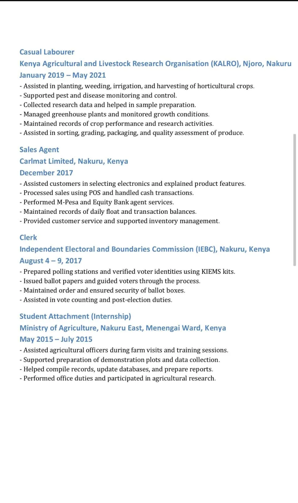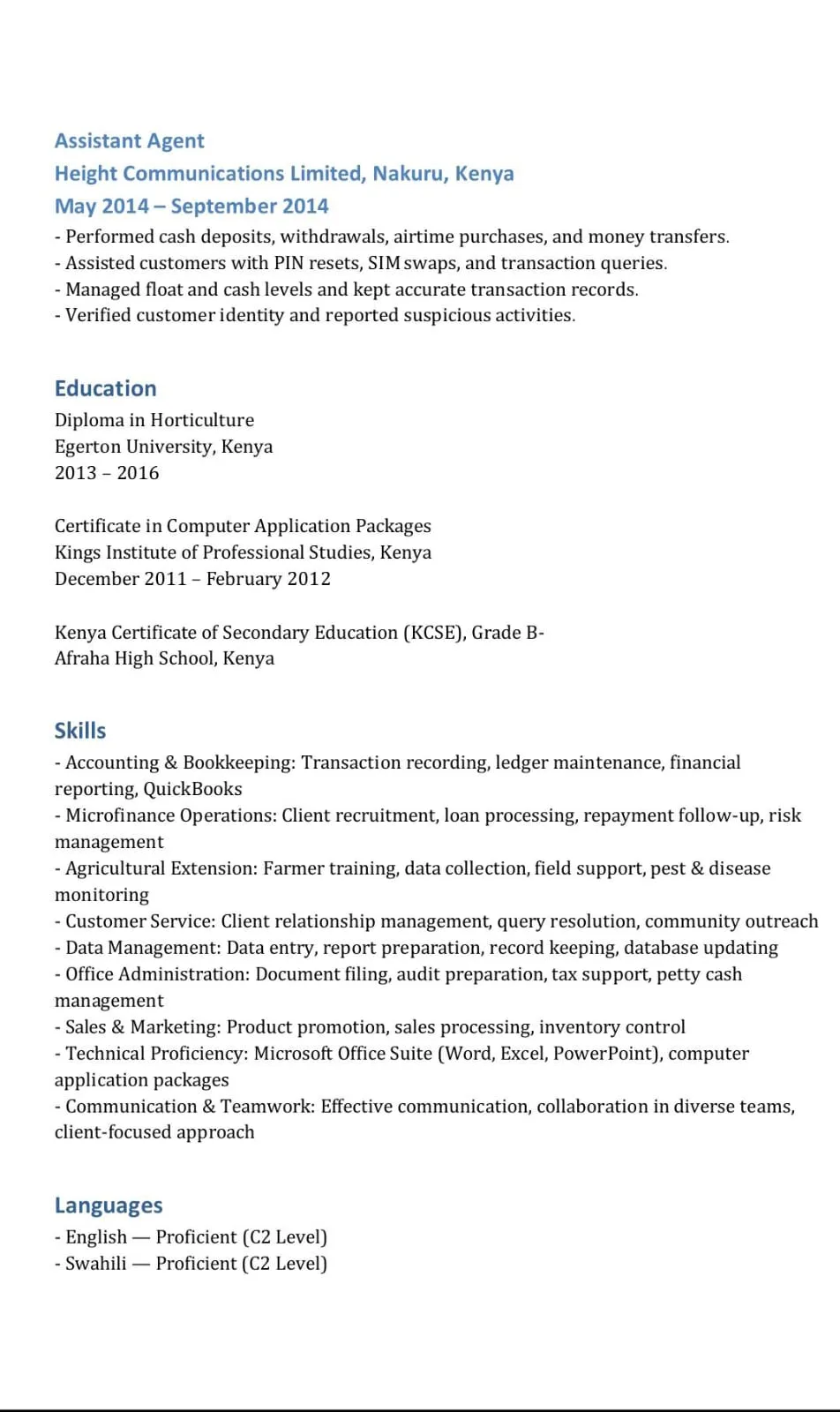 I am a dedicated and detail-oriented professional with experience in accounting, business development, and agricultural support. I have worked with organizations such as Kabiro and Associates, Jiweze Limited, and KALRO, gaining strong skills in financial management, data handling, and client service. I am committed to accuracy, integrity, and continuous growth, and I aim to contribute positively to organizational success through efficient and reliable work.